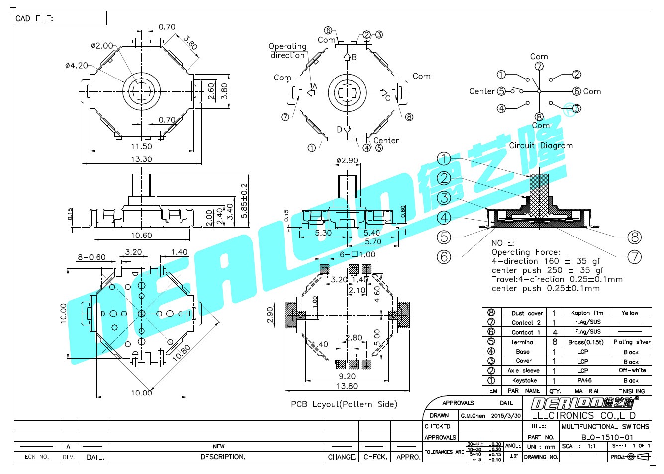 多功能開關,型號:BLQ-1510-01,尺寸:11.5mm*10mm,由德藝隆精密工業股份有限公司研發生產。自主開發產品包括多功能開關、輕觸開關、檢測開關、滑動開關、帶燈輕觸開關、按鍵開關、微動開關、耳機插座、DC插座等。